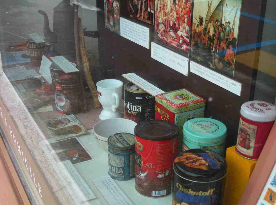 Panneaux explicatifs. Sur celui de droite l'on peu lire :* le chocolat * était vendu comme *médicament * dans les pharmacies. N'est-il pas plein de magnésium ! Ne lutte-t-il pas contre la déprime ?